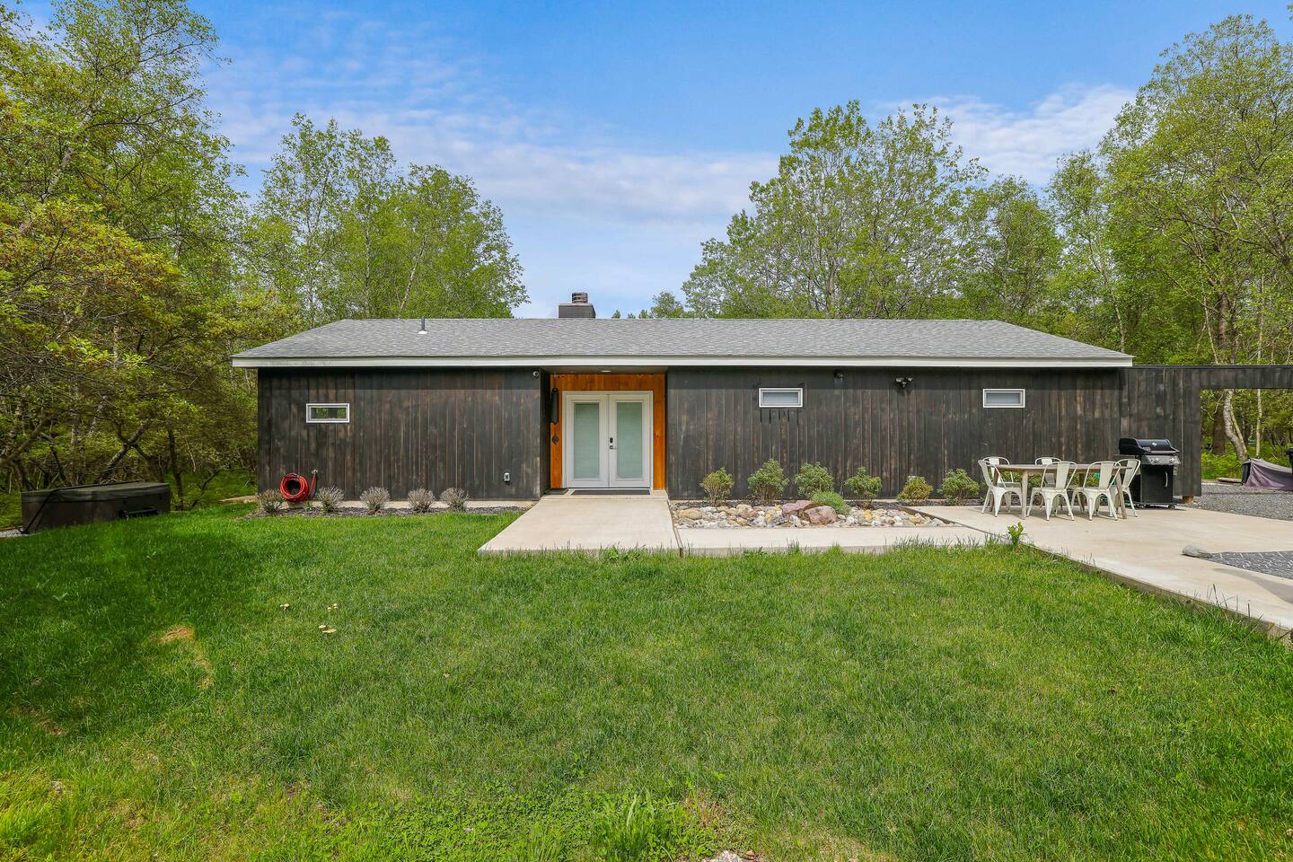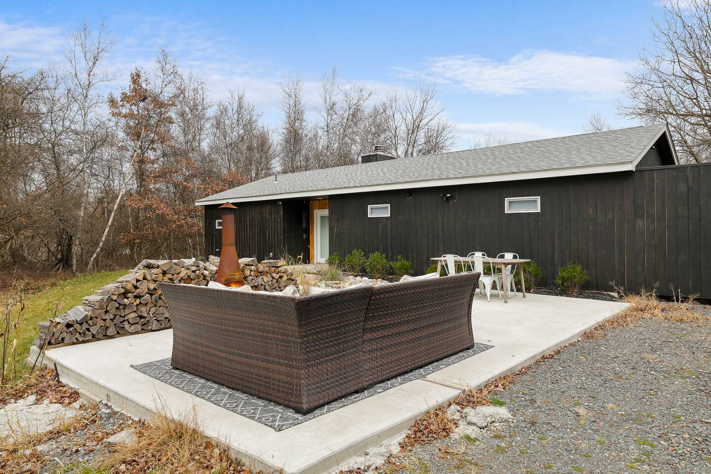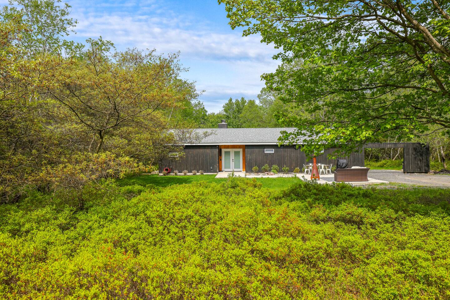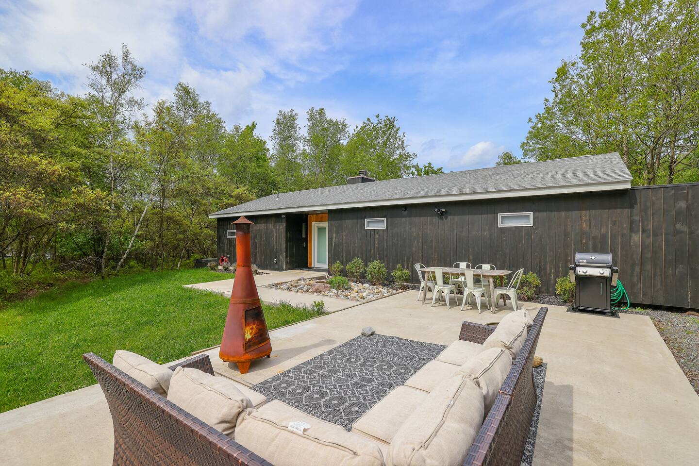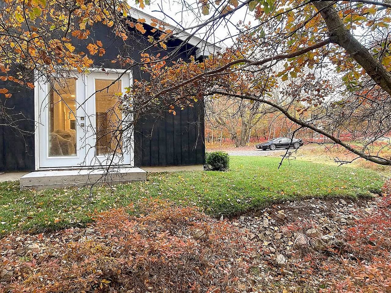 Escape the hustle of the big city in style at this picture-perfect open floor plan Modern Ranch Home, nestled in nature surrounded by 1.5 acres of breathtaking native white birch trees. The Ranch house offers a one-of-a-kind modern rustic aesthetic from the pro design team at Restoration Hardware. Full kitchen, king-size master bedroom, indoor fireplace, indoor & outdoor dining area, outdoor lounge, rustic chiminea-style firepit. There’s something for the whole family (including furry friends).