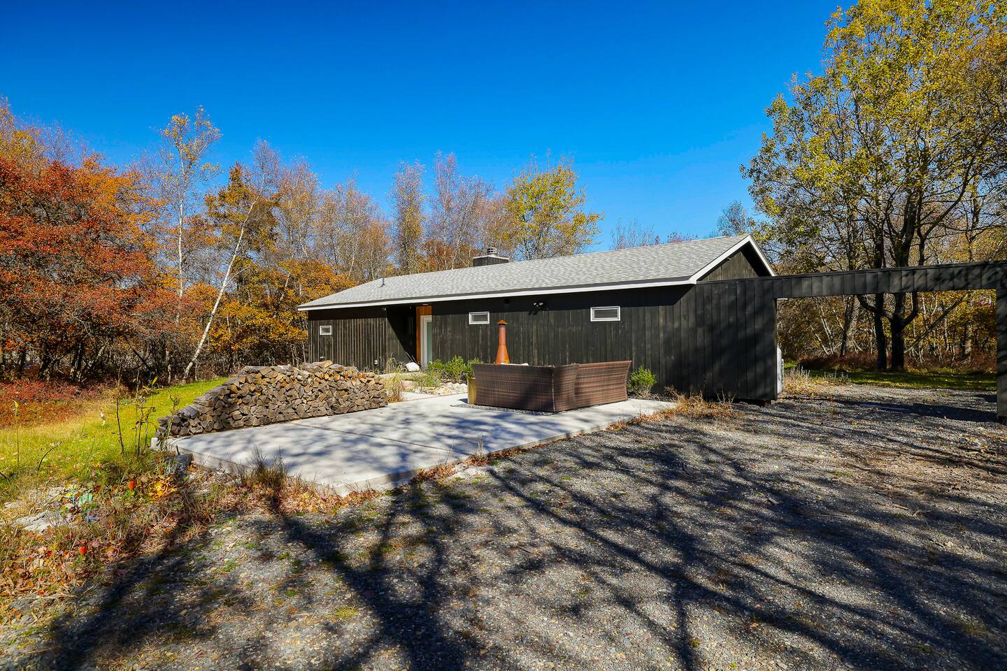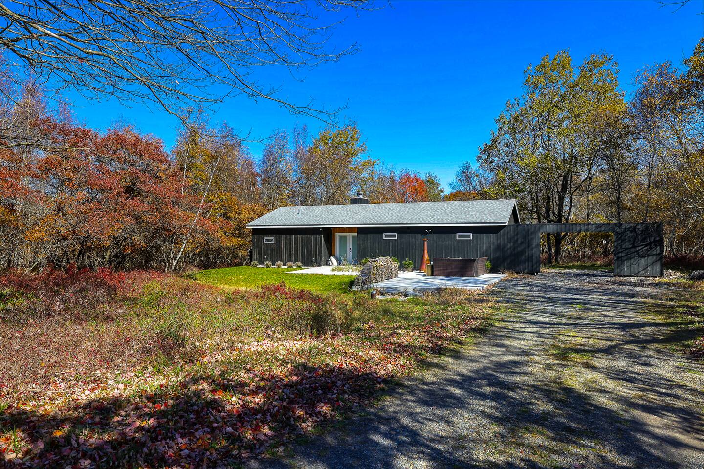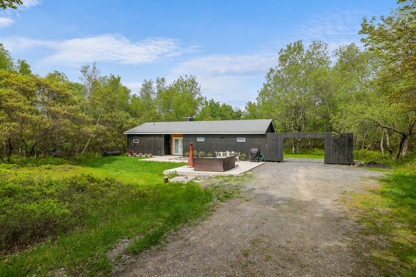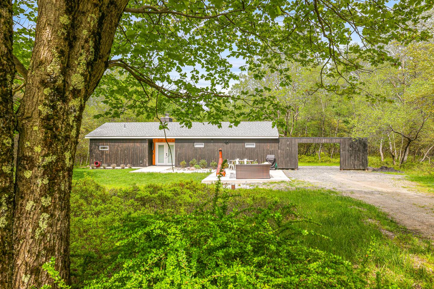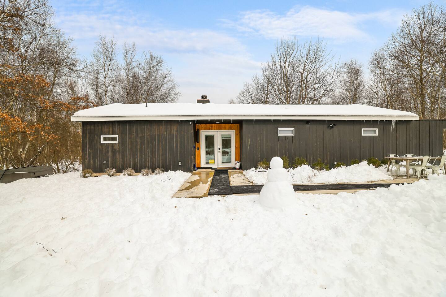 Escape the hustle of the big city in style at this picture-perfect open floor plan Modern Ranch Home, nestled in nature surrounded by 1.5 acres of breathtaking native white birch trees. The Ranch house offers a one-of-a-kind modern rustic aesthetic from the pro design team at Restoration Hardware. Full kitchen, king-size master bedroom, indoor fireplace, indoor & outdoor dining area, outdoor lounge, rustic chiminea-style firepit. There’s something for the whole family (including furry friends).