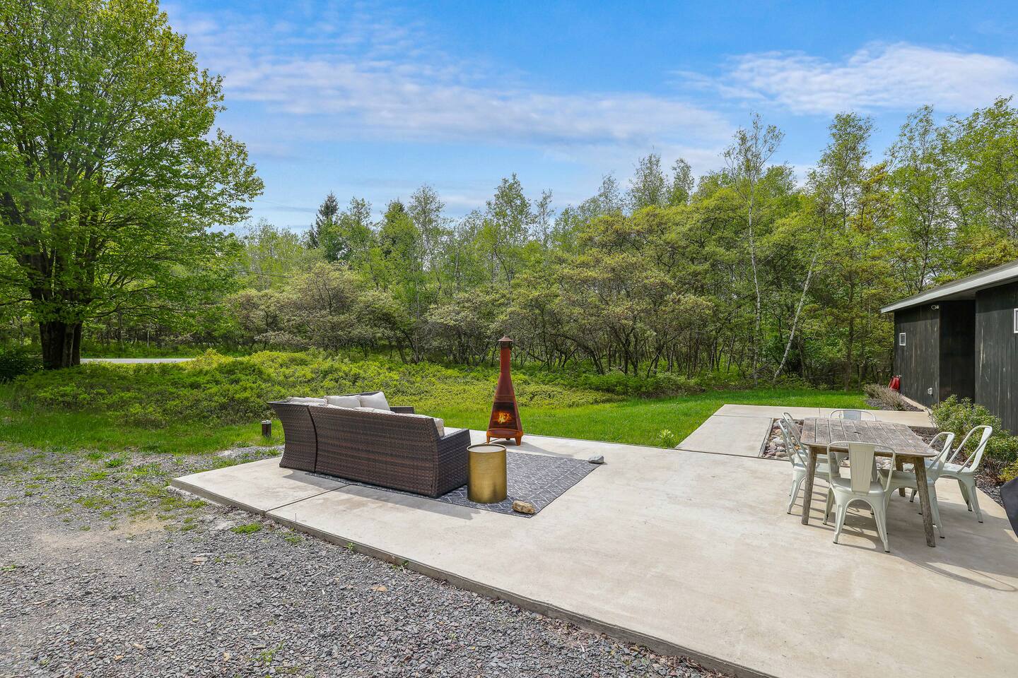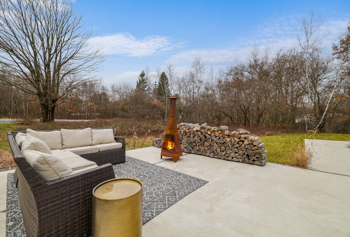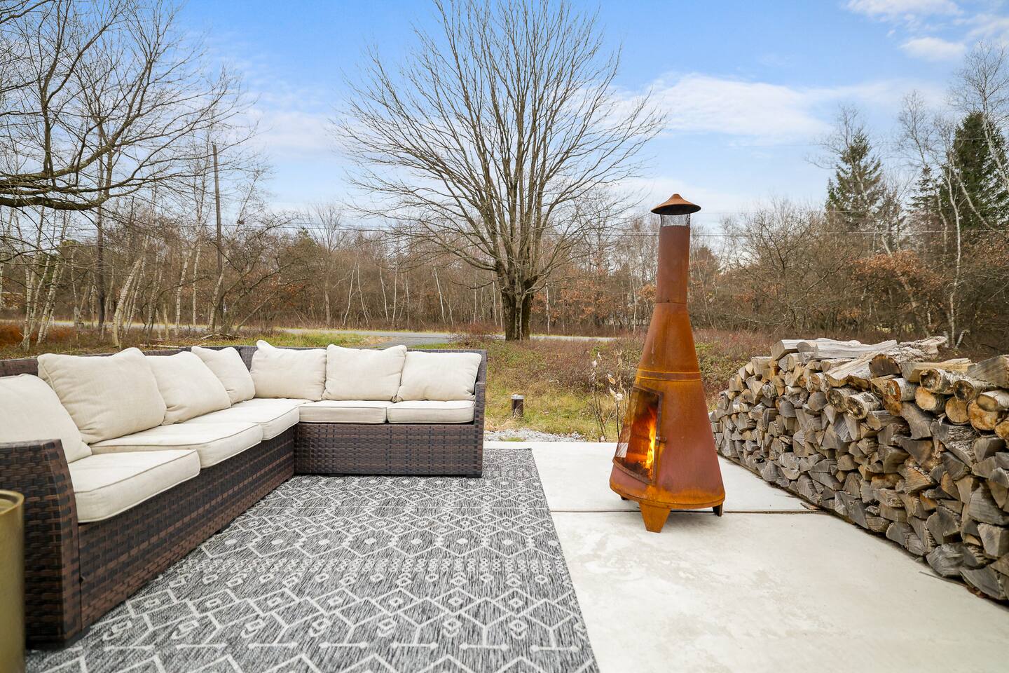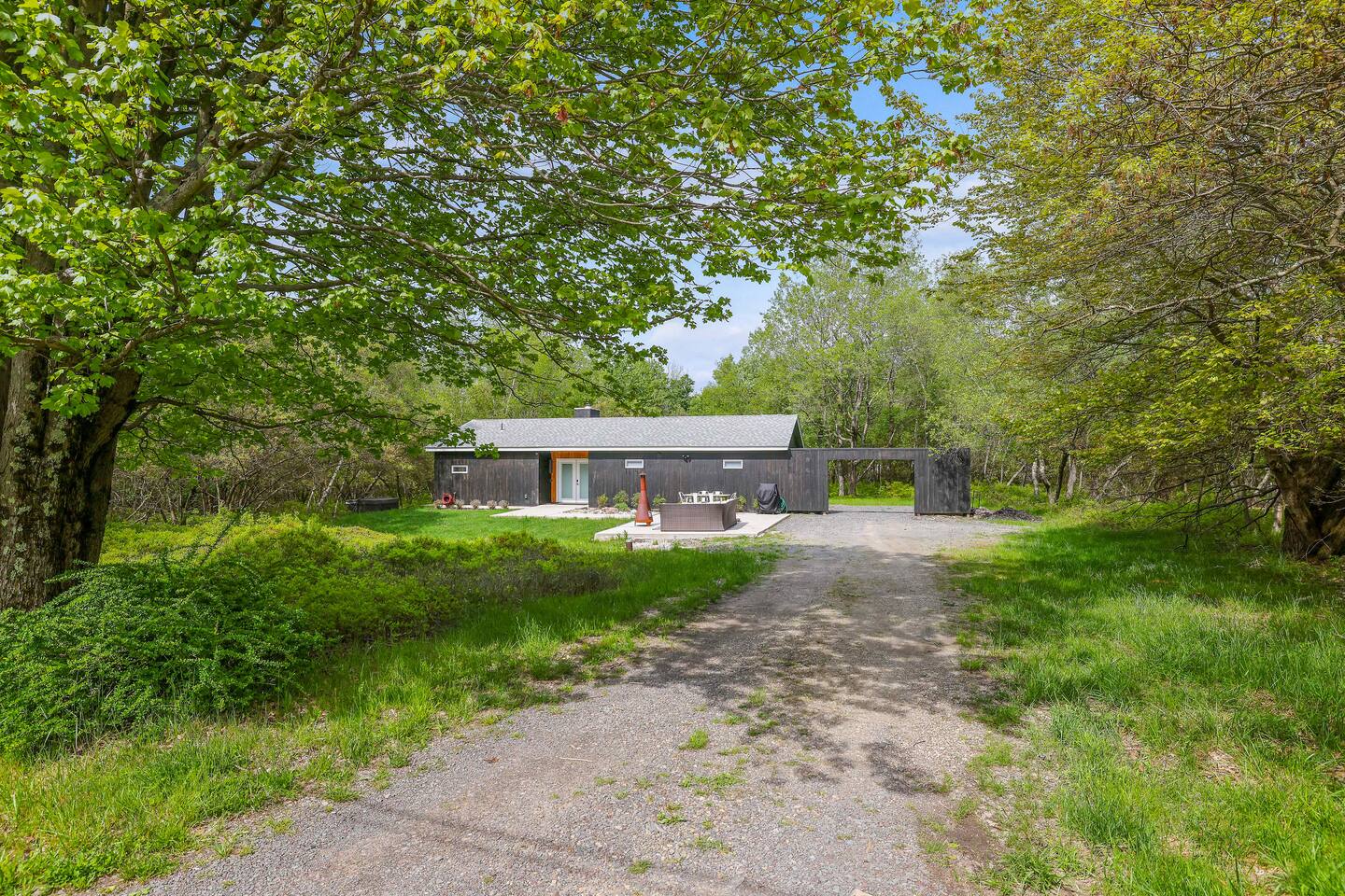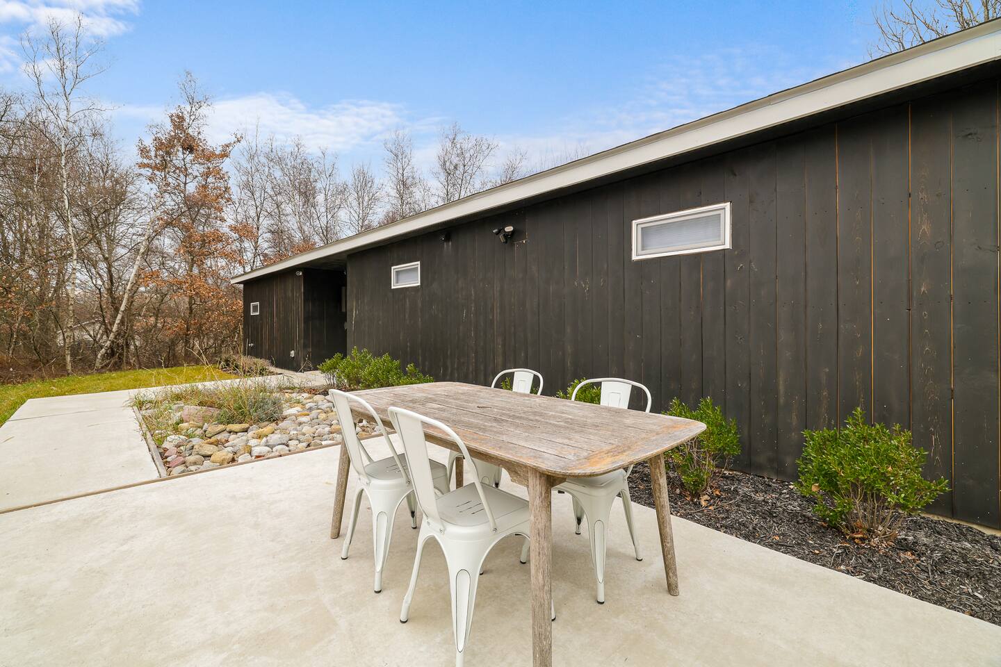 Escape the hustle of the big city in style at this picture-perfect open floor plan Modern Ranch Home, nestled in nature surrounded by 1.5 acres of breathtaking native white birch trees. The Ranch house offers a one-of-a-kind modern rustic aesthetic from the pro design team at Restoration Hardware. Full kitchen, king-size master bedroom, indoor fireplace, indoor & outdoor dining area, outdoor lounge, rustic chiminea-style firepit. There’s something for the whole family (including furry friends).