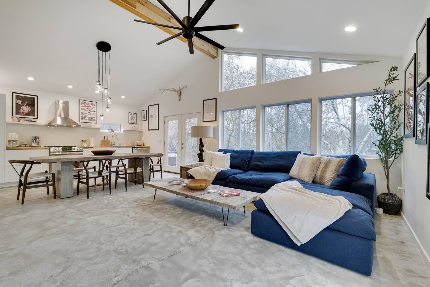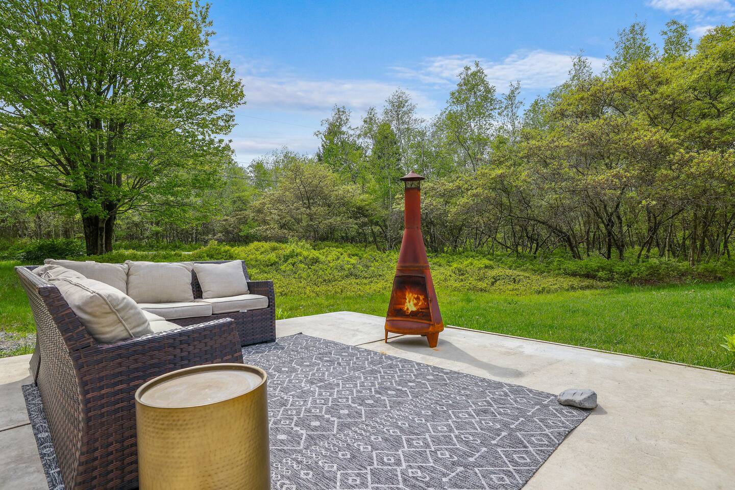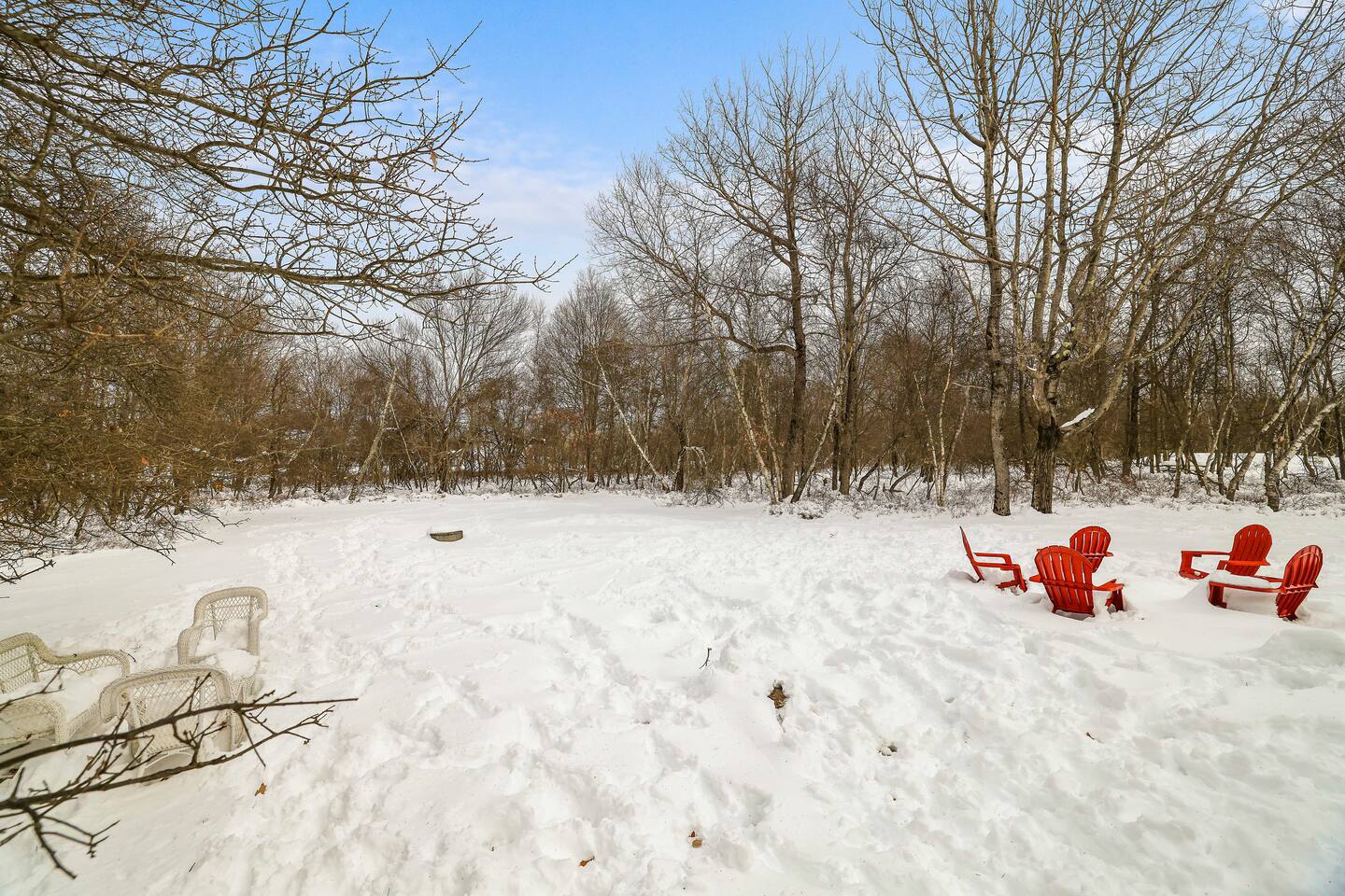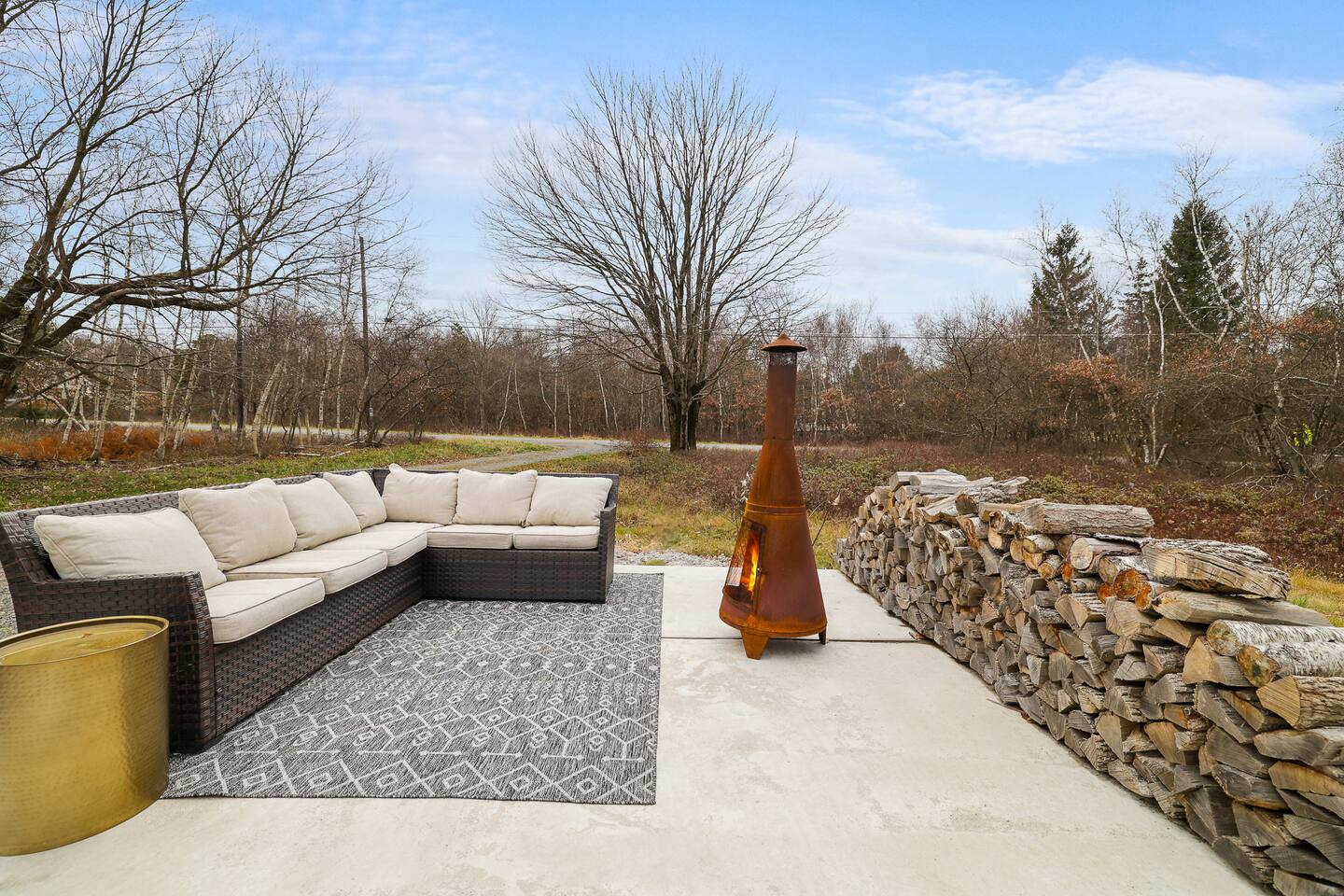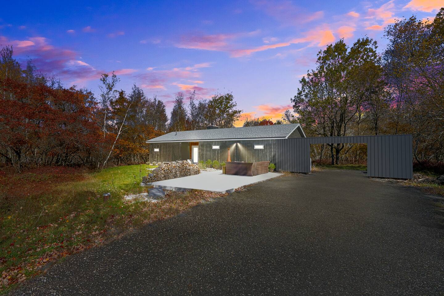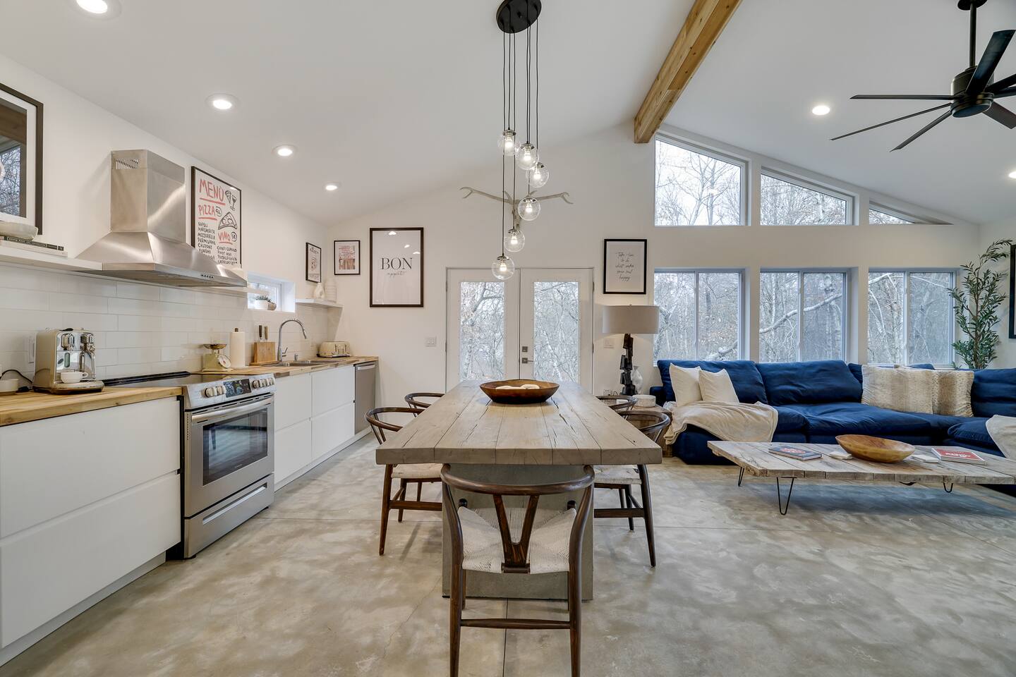 Escape the hustle of the big city in style at this picture-perfect open floor plan Modern Ranch Home, nestled in nature surrounded by 1.5 acres of breathtaking native white birch trees. The Ranch house offers a one-of-a-kind modern rustic aesthetic from the pro design team at Restoration Hardware. Full kitchen, king-size master bedroom, indoor fireplace, indoor & outdoor dining area, outdoor lounge, rustic chiminea-style firepit. There’s something for the whole family (including furry friends).