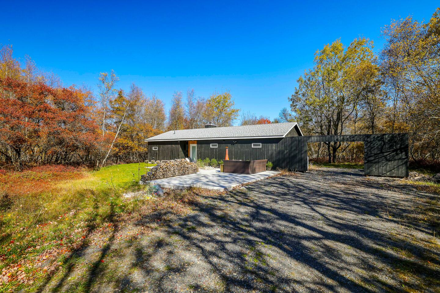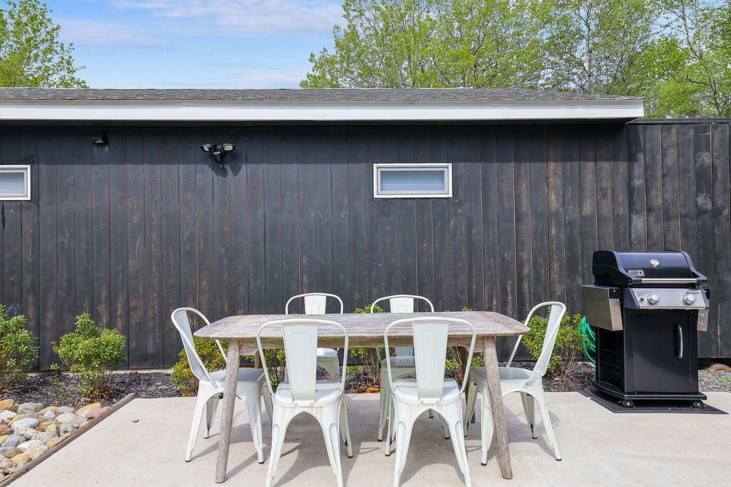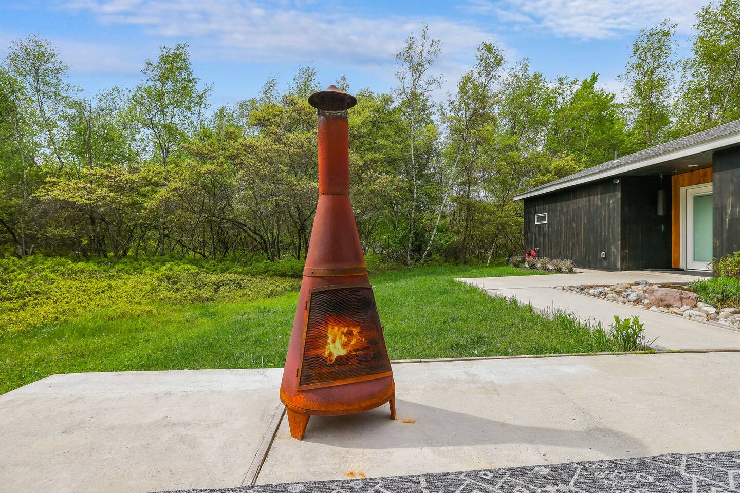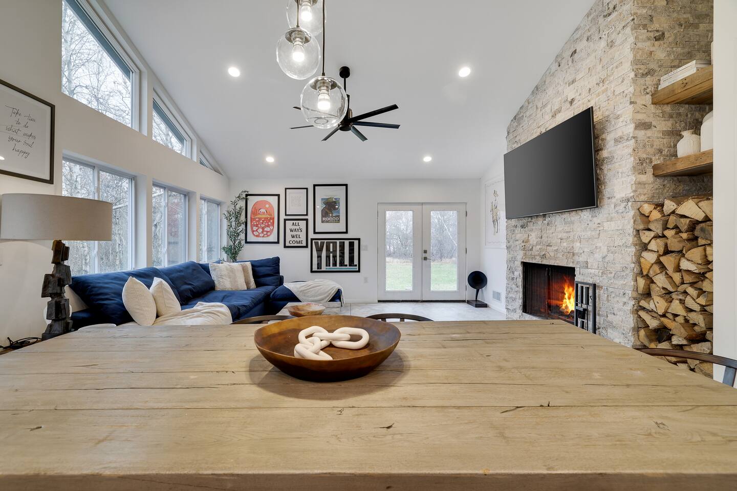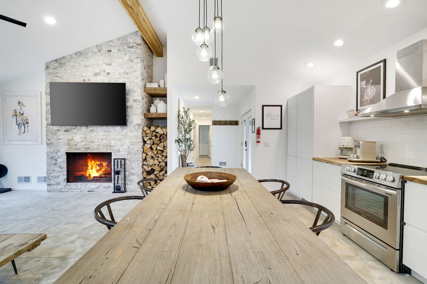 Escape the hustle of the big city in style at this picture-perfect open floor plan Modern Ranch Home, nestled in nature surrounded by 1.5 acres of breathtaking native white birch trees. The Ranch house offers a one-of-a-kind modern rustic aesthetic from the pro design team at Restoration Hardware. Full kitchen, king-size master bedroom, indoor fireplace, indoor & outdoor dining area, outdoor lounge, rustic chiminea-style firepit. There’s something for the whole family (including furry friends).
