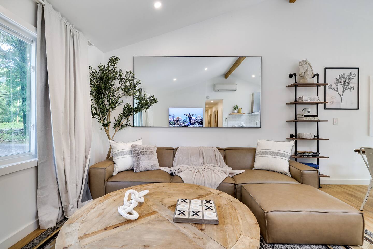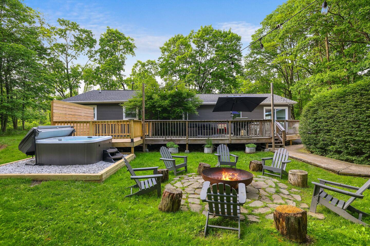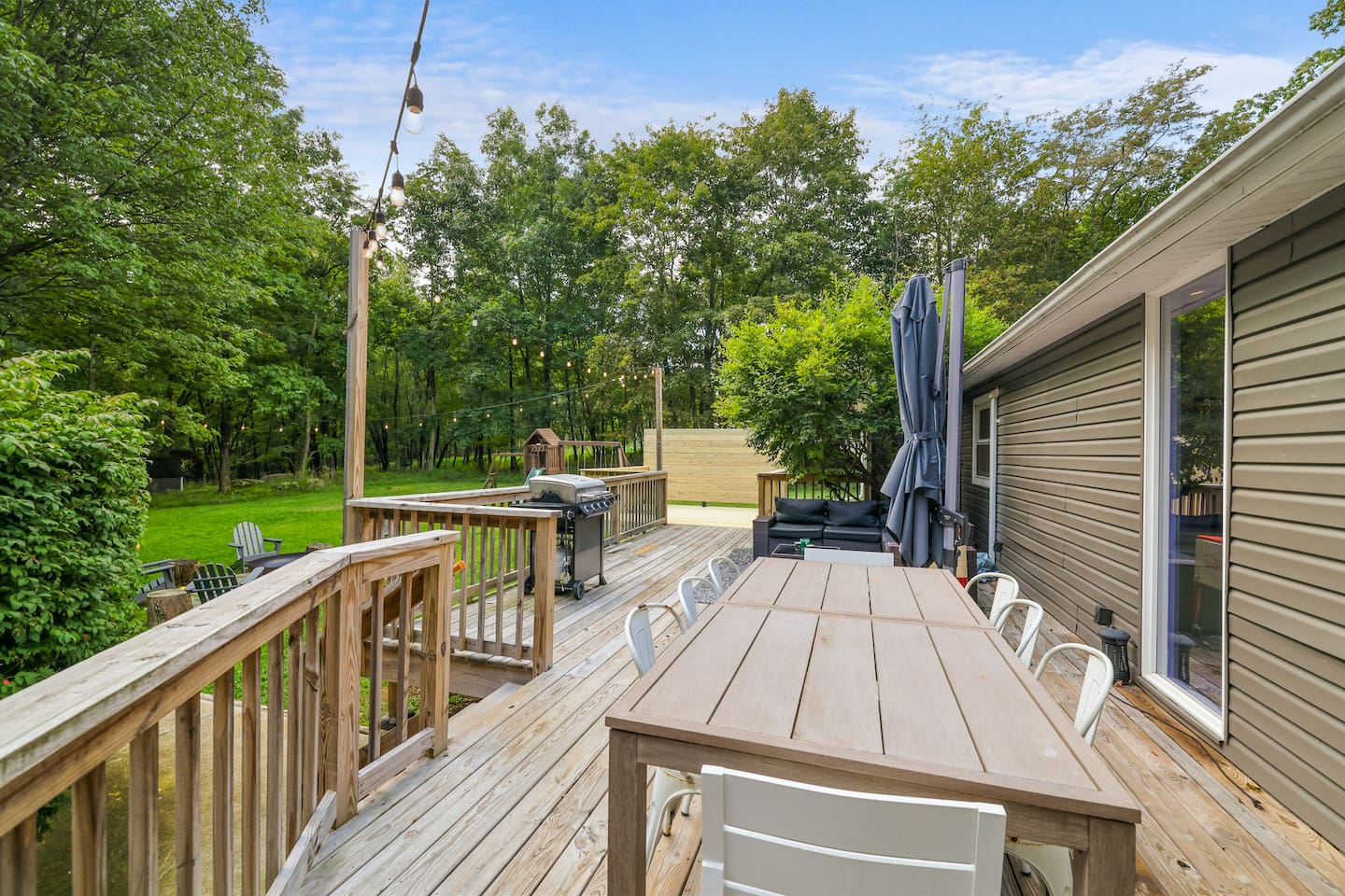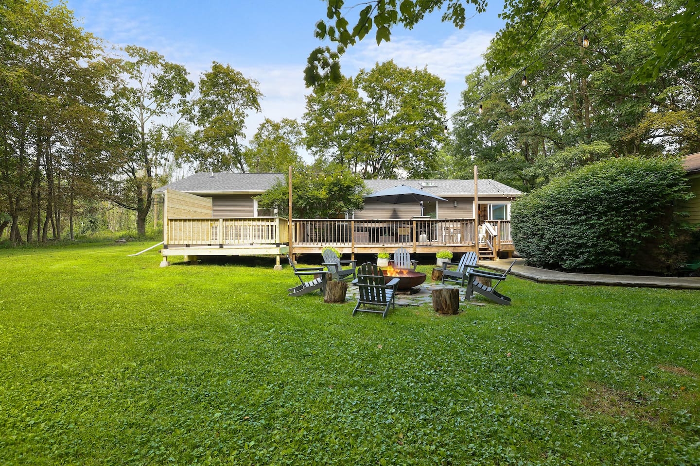 Escape to our newly remodeled secluded Modern Ranch home nestled in the heart of the Pocono Mountains! This luxurious 4 bedroom 2 bathroom retreat boasts, a living area and a smart gym with Peloton & Lululemon Mirror. Relax in the spacious outdoor patio, outdoor dining area, & private lounge. Kickback around the reclaimed steel firepit under the stars. Book your getaway now and reconnect with nature in style. Smart Gym Includes Lulu Lemon Smart Mirror + Peloton Roku Smart 4kTV in every room!