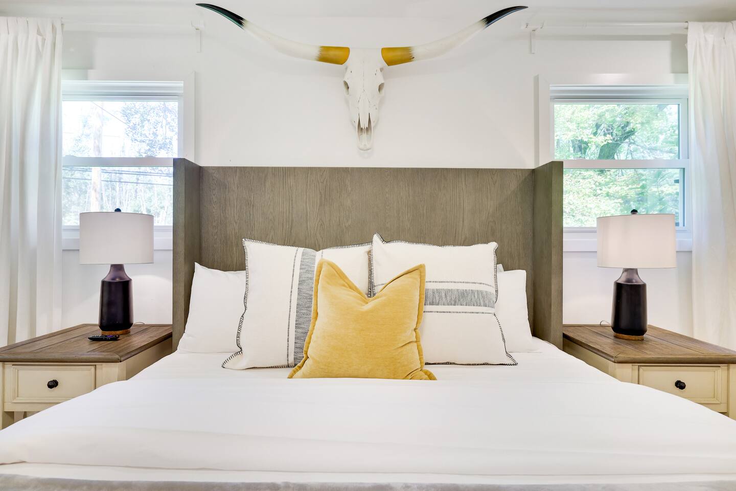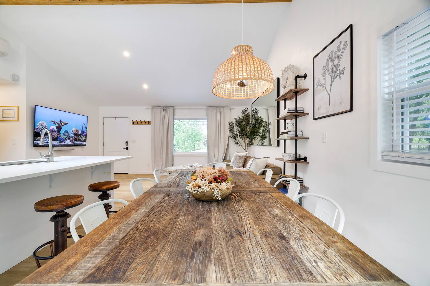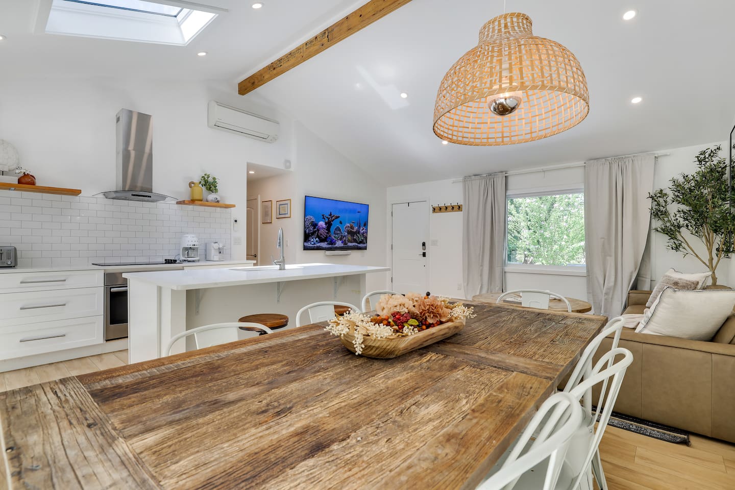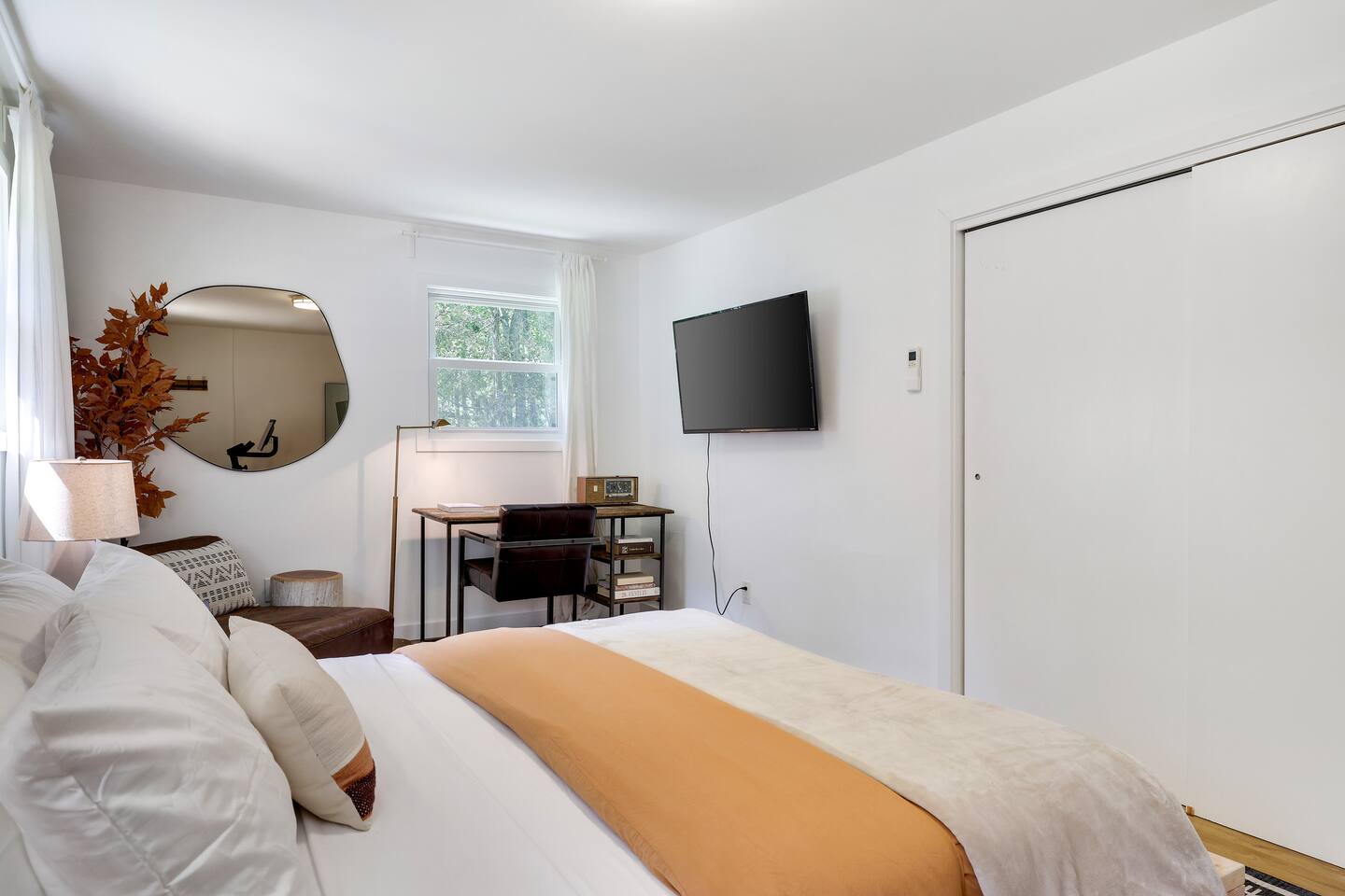 Home: One floor- open layout- 4 bed - 2 baths - 1550 Sq Feet MAIN FLOOR: Nestled in the mountains, this beautiful ranch boasts an open plan kitchen, dining, and living area that is perfect for entertaining. The kitchen is fully equipped with modern appliances and plenty of counter space for preparing meals. The dining area features an 8 foot dining table that seats up to eight people, making it perfect for hosting dinner parties or game nights. The living room serves as the perfect spot to curl up with a good book on a cold winter's night on our 8 foot leather RH Luxe size couch. A 65-inch smart 4K Roku Smart TV provides endless entertainment options for movie nights or streaming your favorite shows. Step outside and you'll find a walkout deck that is perfect for al fresco dining. The deck features a dining table and an outdoor grill, making it easy to cook up a delicious meal while enjoying the fresh mountain air. KITCHEN: - Smeg Drip Coffee Machine - Nespresso Longhi Coffee Machine - Breveille Electric Kettle - Electric Toaster - Stainless steel appliances - Utensils, Mugs, Glass Cups, Wine Glass + much more LIVING AREA: 8 Foot RH Leather Couch 65in Smart 4k TV Large Coffee Table BEDROOM DETAILS: The master is a stylish Cali king size bedroom with a private bathroo is a luxurious and comfortable space that is perfect for relaxation. The Cali king size bed is larger than a standard king size bed, offering plenty of room to stretch out and relax. The private bathroom adds an extra level of privacy and convenience, and the smart 55in 4k TV provides a high-quality entertainment experience. We also have a second Cali king size bedroom, with a gym area equipped with Peloton, and Lululemon mirror, as well as a private seating area, and desk for remote work. The two stylish and comfortable queen size bedrooms offer plenty of space for guests to rest and relax. All of the bedrooms are equipped with smart 55in 4k TVs, ensuring that guests have access to top-quality entertainment. BEDROOM 1 (: California King Size Bed private in suite bathroom private seating area crib 55in Smart Roku 4k TV BEDROOM 2 : California King size Bed private Lounge Chair Small Desk area for remote work Peloton and Lululemon work out area 55in Smart Roku 4k TV BEDROOM 3 : Queen Size Bed 55in Smart Roku 4k TV BEDROOM 4 : Queen Size Bed 55in Smart Roku TV Ground Floor: A beautiful open layout living area with a large 10 foot modular couch, a 65 inch smart roku TV. The modular couch is a comfortable and spacious spot for guests to relax and socialize, with its comfortable cushions and ample seating room. The 75k TV, mounted on the wall, provides a clear and high-quality viewing experience for movies, TV shows, and sports. Overall, this living area is a stunning and inviting space that provides guests with a luxurious and enjoyable vacation experience. OUTDOOR: The Home has a beautiful outdoor space with a large deck off to the side of house with an L-shaped couch, a 10-foot umbrella, is a comfortable and functional area for entertaining and relaxing. The L-shaped couch, placed on the deck offers plenty of seating room and a cozy place to relax and enjoy the outdoors. To provide shade and protection from the sun, you have a 10-foot umbrella, which is mounted on the deck. The umbrella will provide a large area of shade, making it a perfect spot to sit and relax during hot summer days. Finally, to add some ambiance and warmth to the outdoor space, you have an outdoor four foot diameter reclaimed steel outdoor firepit. The outdoor fireplace could be used to roast marshmallows, provide warmth on cool evenings, or simply create a cozy and inviting atmosphere. Overall, this outdoor space is a great place to relax, entertain, and enjoy the outdoors.