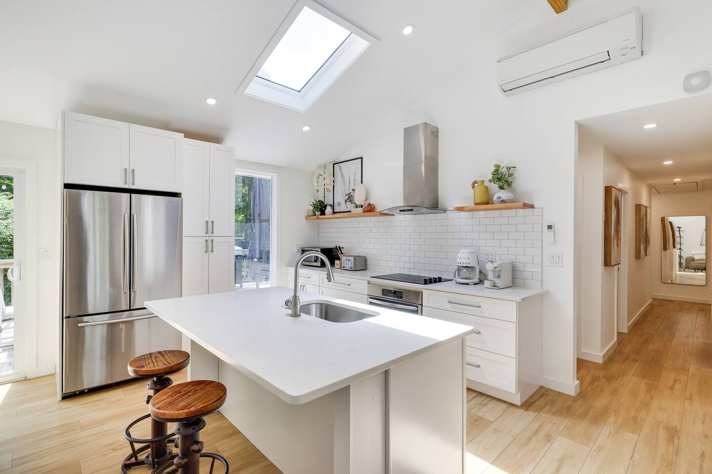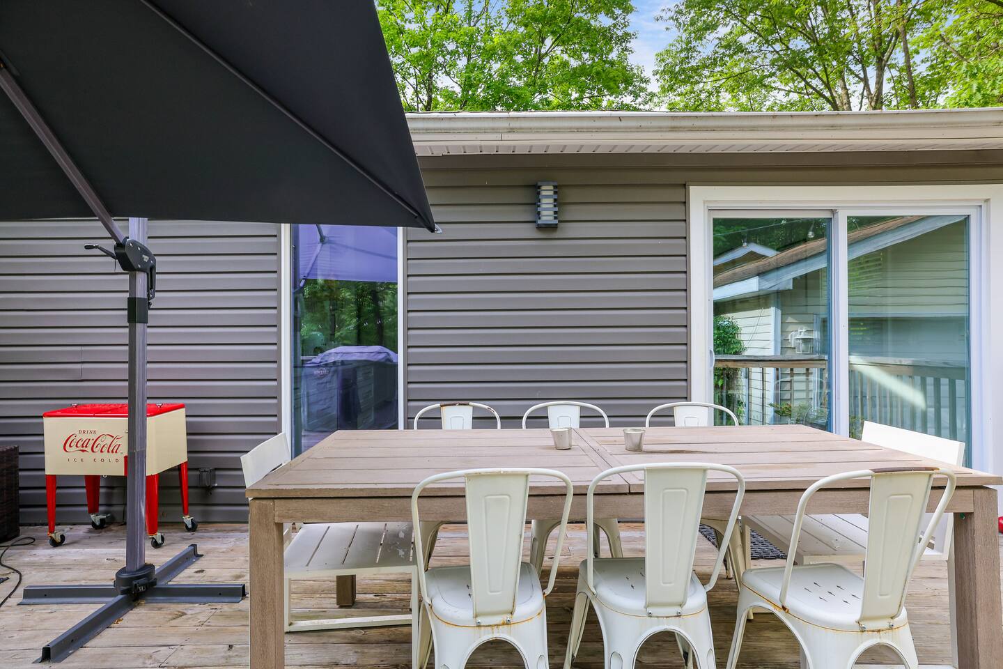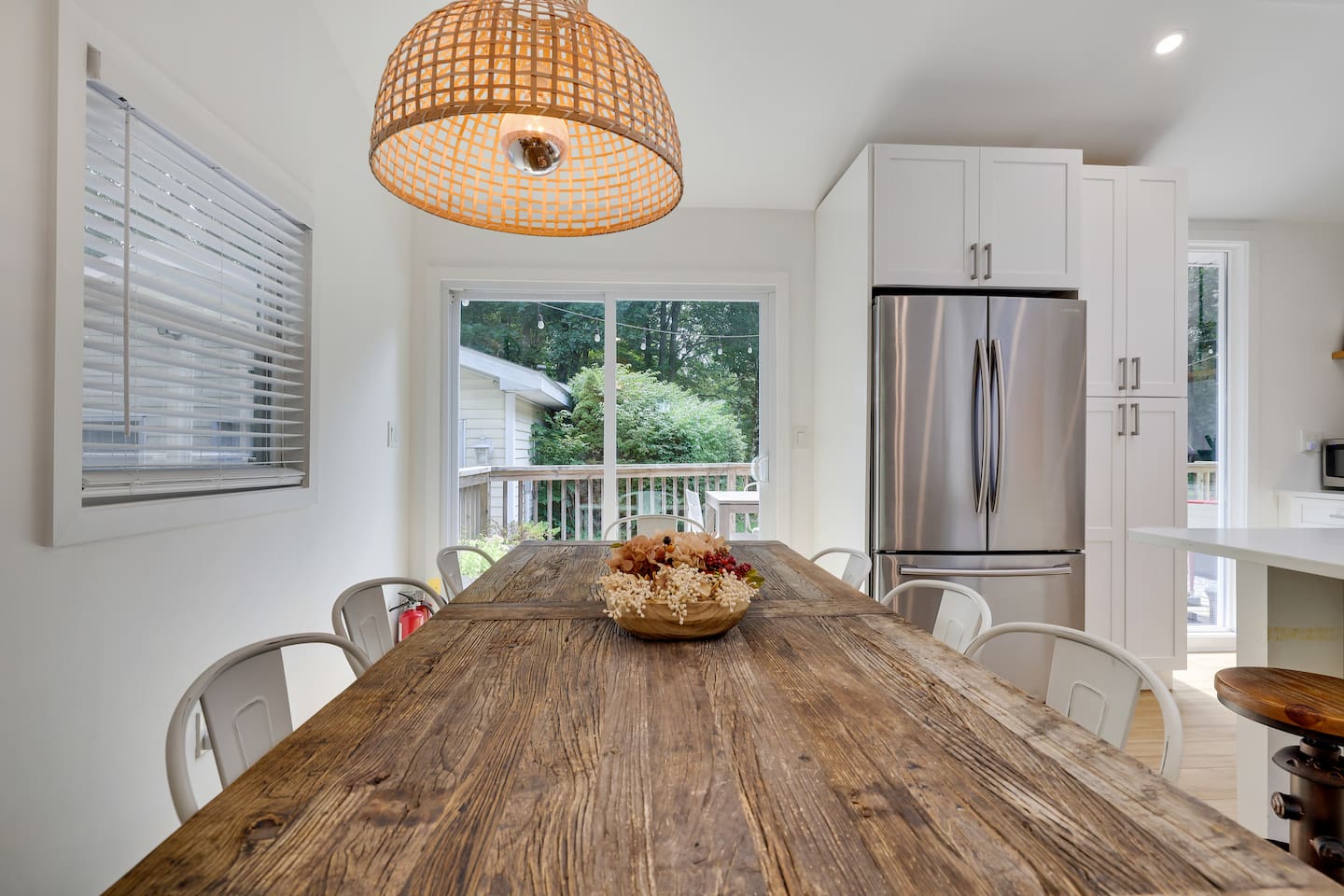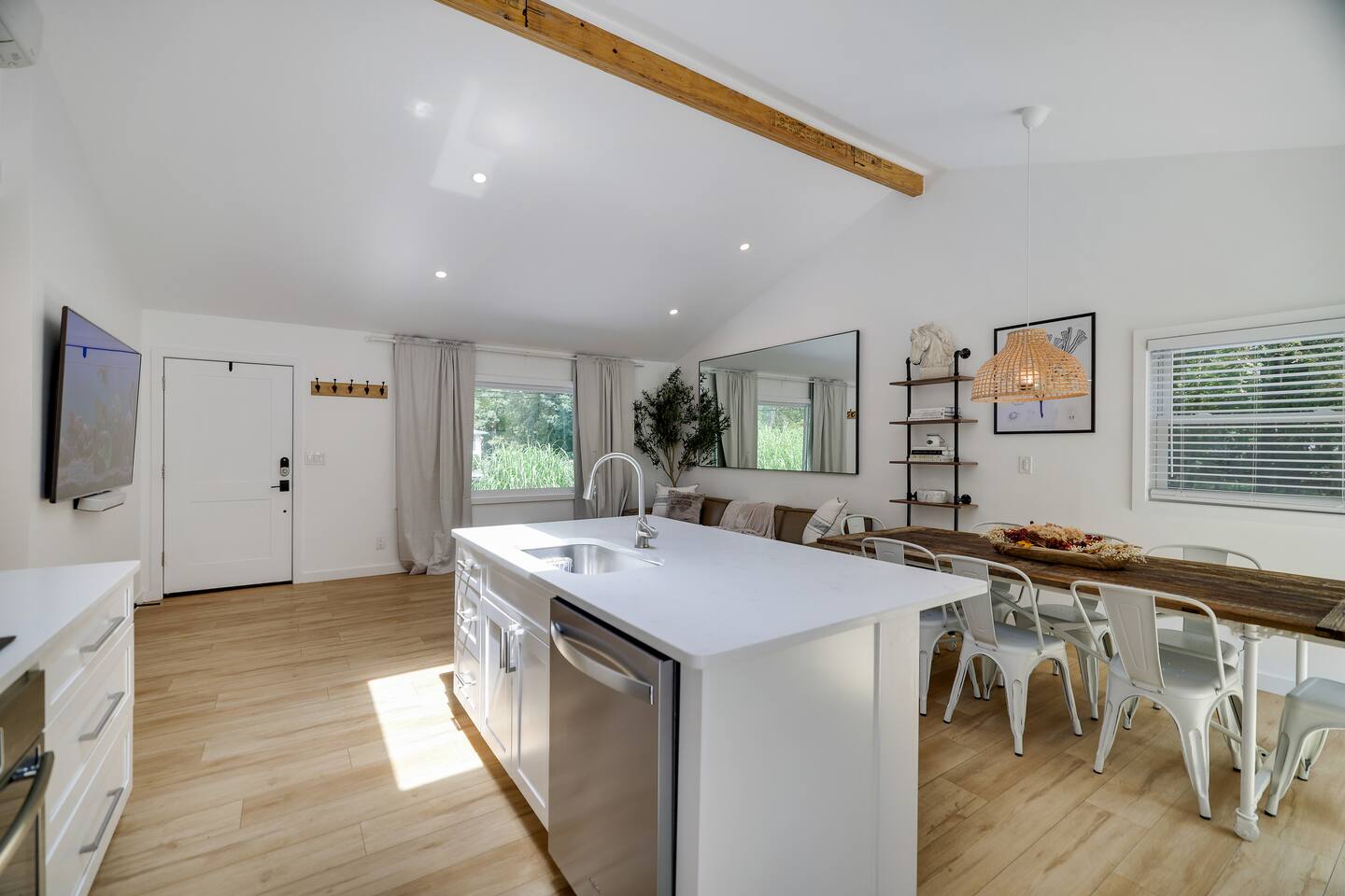 Home: One floor- open layout- 4 bed - 2 baths - 1550 Sq Feet MAIN FLOOR: Nestled in the mountains, this beautiful ranch boasts an open plan kitchen, dining, and living area that is perfect for entertaining. The kitchen is fully equipped with modern appliances and plenty of counter space for preparing meals. The dining area features an 8 foot dining table that seats up to eight people, making it perfect for hosting dinner parties or game nights. The living room serves as the perfect spot to curl up with a good book on a cold winter's night on our 8 foot leather RH Luxe size couch. A 65-inch smart 4K Roku Smart TV provides endless entertainment options for movie nights or streaming your favorite shows. Step outside and you'll find a walkout deck that is perfect for al fresco dining. The deck features a dining table and an outdoor grill, making it easy to cook up a delicious meal while enjoying the fresh mountain air. KITCHEN: - Smeg Drip Coffee Machine - Nespresso Longhi Coffee Machine - Breveille Electric Kettle - Electric Toaster - Stainless steel appliances - Utensils, Mugs, Glass Cups, Wine Glass + much more LIVING AREA: 8 Foot RH Leather Couch 65in Smart 4k TV Large Coffee Table BEDROOM DETAILS: The master is a stylish Cali king size bedroom with a private bathroo is a luxurious and comfortable space that is perfect for relaxation. The Cali king size bed is larger than a standard king size bed, offering plenty of room to stretch out and relax. The private bathroom adds an extra level of privacy and convenience, and the smart 55in 4k TV provides a high-quality entertainment experience. We also have a second Cali king size bedroom, with a gym area equipped with Peloton, and Lululemon mirror, as well as a private seating area, and desk for remote work. The two stylish and comfortable queen size bedrooms offer plenty of space for guests to rest and relax. All of the bedrooms are equipped with smart 55in 4k TVs, ensuring that guests have access to top-quality entertainment. BEDROOM 1 (: California King Size Bed private in suite bathroom private seating area crib 55in Smart Roku 4k TV BEDROOM 2 : California King size Bed private Lounge Chair Small Desk area for remote work Peloton and Lululemon work out area 55in Smart Roku 4k TV BEDROOM 3 : Queen Size Bed 55in Smart Roku 4k TV BEDROOM 4 : Queen Size Bed 55in Smart Roku TV Ground Floor: A beautiful open layout living area with a large 10 foot modular couch, a 65 inch smart roku TV. The modular couch is a comfortable and spacious spot for guests to relax and socialize, with its comfortable cushions and ample seating room. The 75k TV, mounted on the wall, provides a clear and high-quality viewing experience for movies, TV shows, and sports. Overall, this living area is a stunning and inviting space that provides guests with a luxurious and enjoyable vacation experience. OUTDOOR: The Home has a beautiful outdoor space with a large deck off to the side of house with an L-shaped couch, a 10-foot umbrella, is a comfortable and functional area for entertaining and relaxing. The L-shaped couch, placed on the deck offers plenty of seating room and a cozy place to relax and enjoy the outdoors. To provide shade and protection from the sun, you have a 10-foot umbrella, which is mounted on the deck. The umbrella will provide a large area of shade, making it a perfect spot to sit and relax during hot summer days. Finally, to add some ambiance and warmth to the outdoor space, you have an outdoor four foot diameter reclaimed steel outdoor firepit. The outdoor fireplace could be used to roast marshmallows, provide warmth on cool evenings, or simply create a cozy and inviting atmosphere. Overall, this outdoor space is a great place to relax, entertain, and enjoy the outdoors.